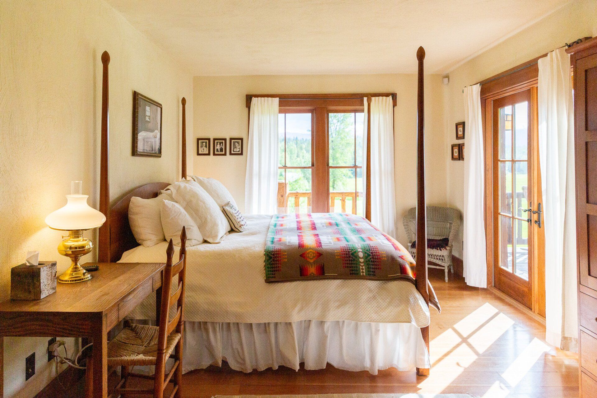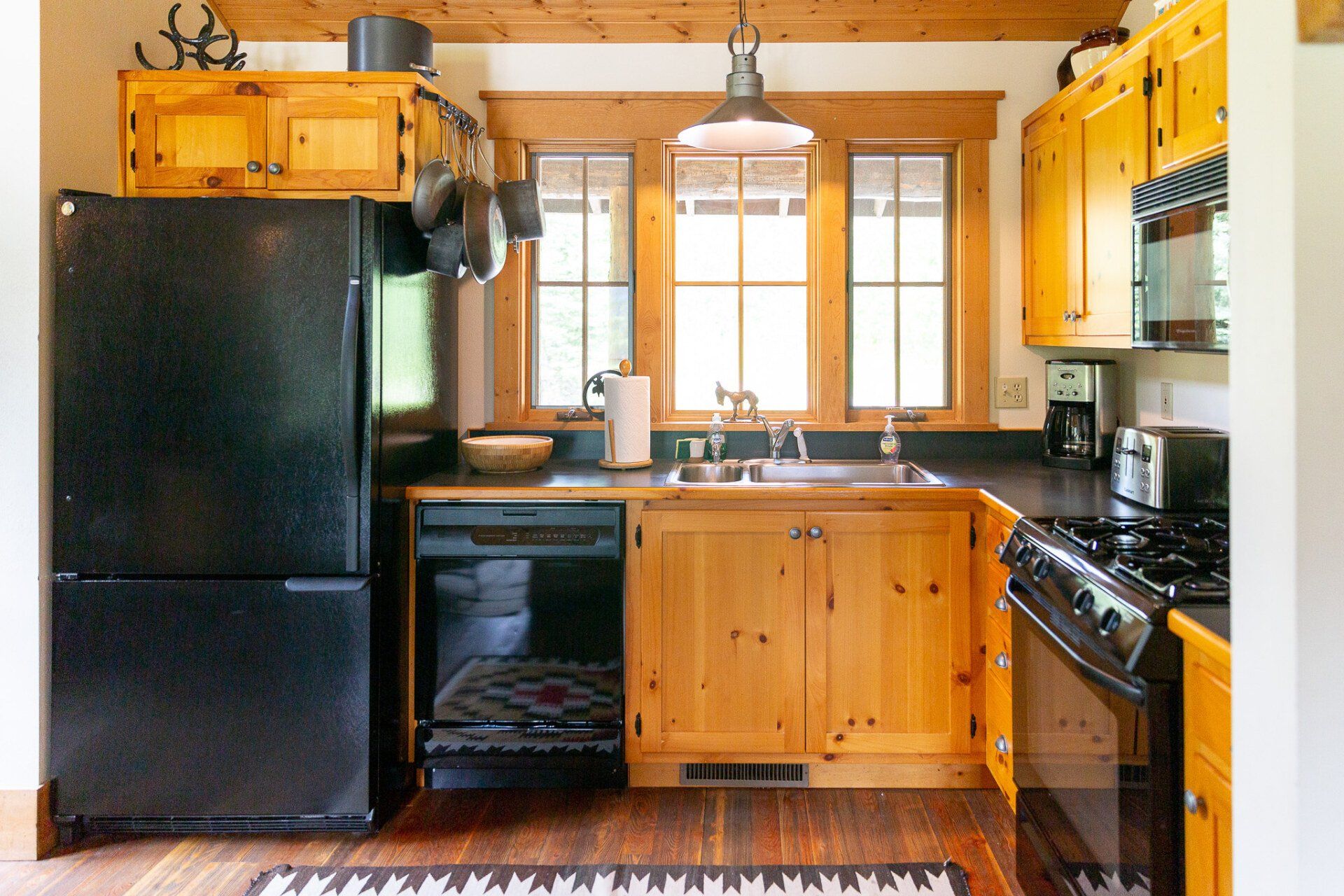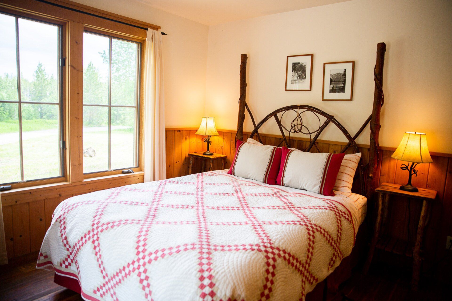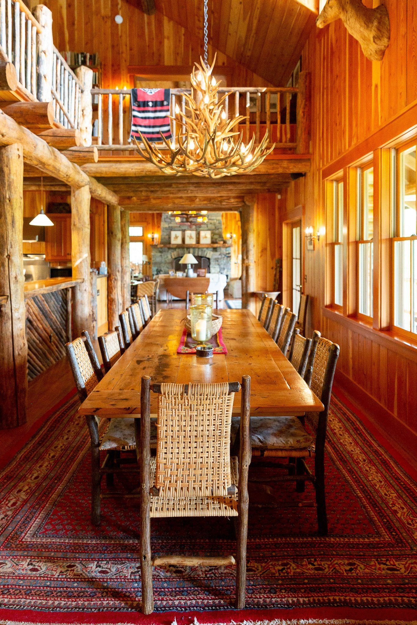 The open kitchen and living room are graced by a river stone fireplace, leather sofa, Old Hickory chairs and Edward Curtis prints. Antiques and Pendleton and Hudson Bay blankets complete the authentic Montana look of the Cabin.