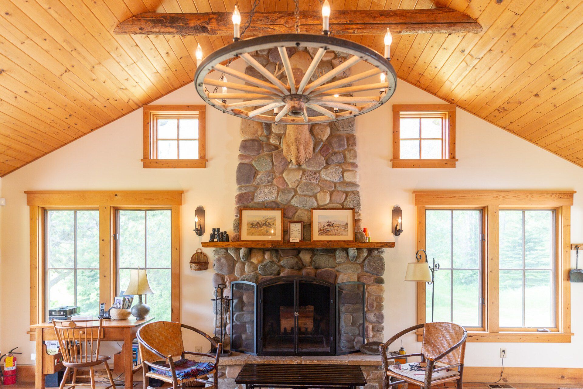 in the Glacier Park lodge tradition, the Lodge was constructed by neighboring craftsmen from reclaimed logs and native stone. The open floor plan offers multiple large common rooms and privacy in five