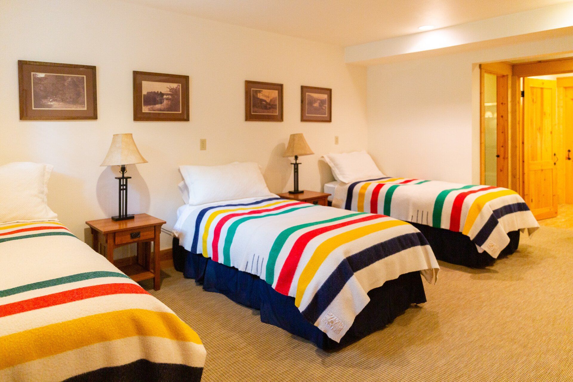 Two main floor bedrooms offer one king and one queen bed, and a lower dorm-style bedroom sleeps five guests.