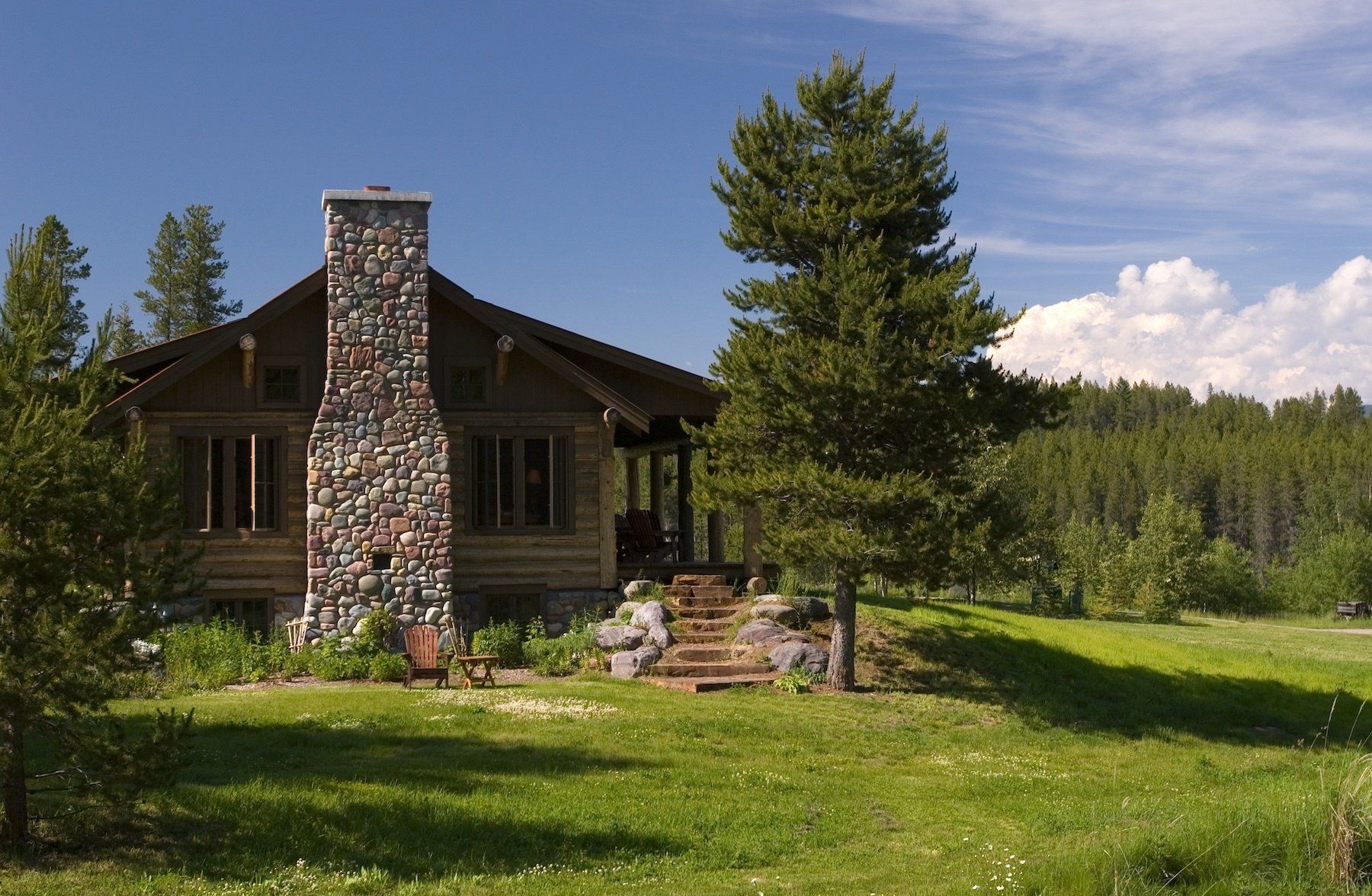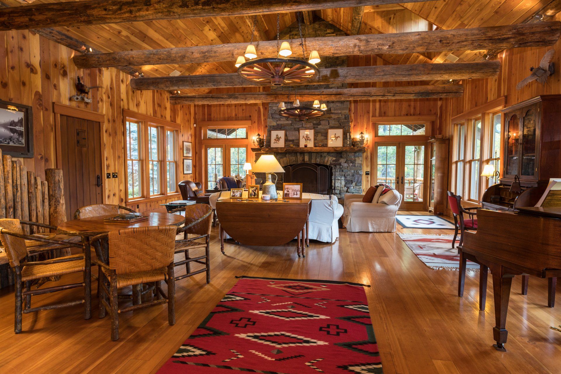 in the Glacier Park lodge tradition, the Lodge was constructed by neighboring craftsmen from reclaimed logs and native stone. The open floor plan offers multiple large common rooms and privacy in five