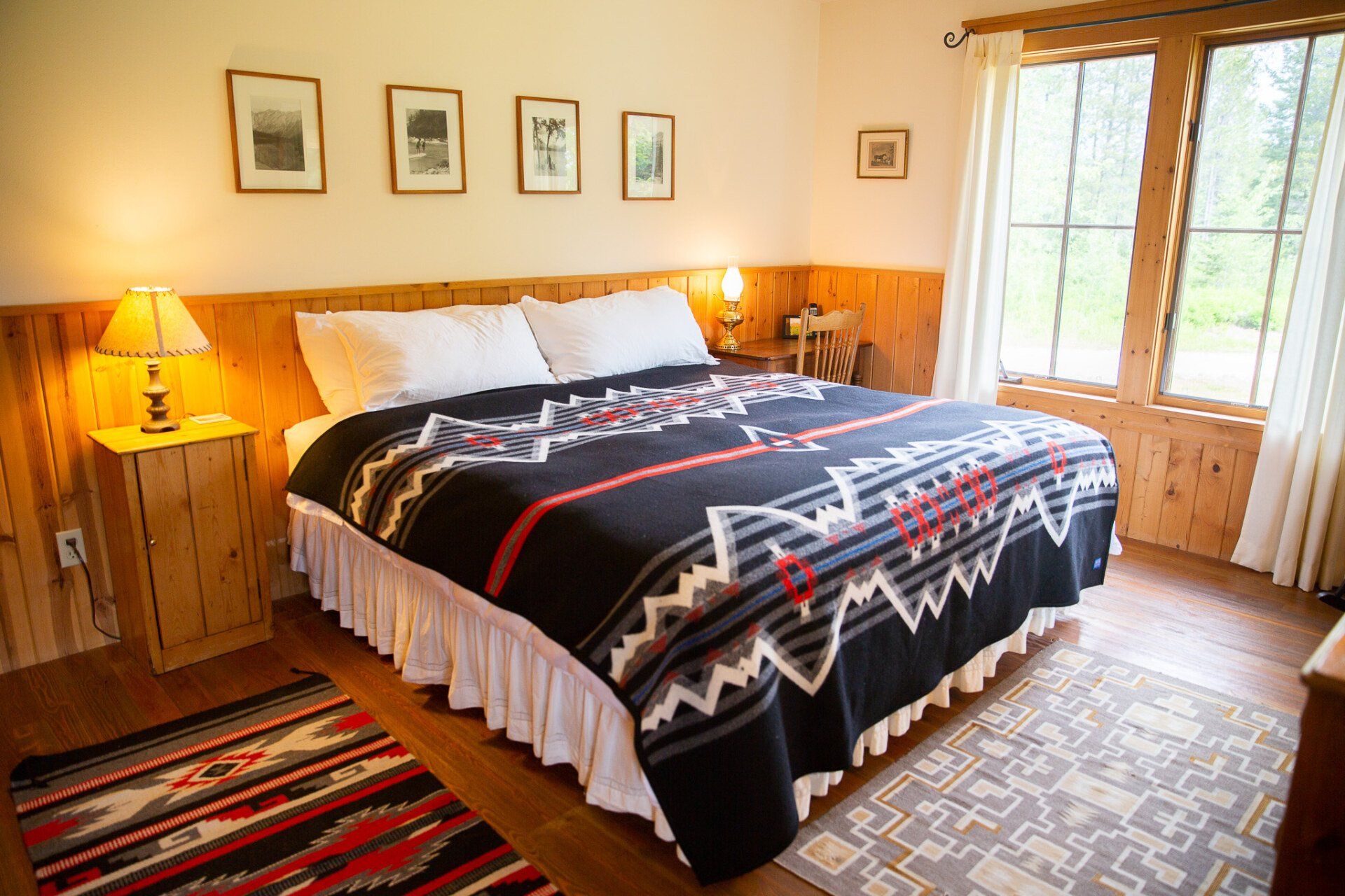 The open kitchen and living room are graced by a river stone fireplace, leather sofa, Old Hickory chairs and Edward Curtis prints. Antiques and Pendleton and Hudson Bay blankets complete the authentic Montana look of the Cabin.
